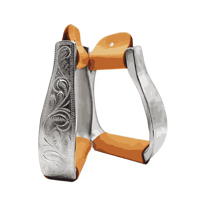 Engraved aluminium stirrups. Engraved / decorated by hand. Leather tread. Supplied in pairs (2 pieces)