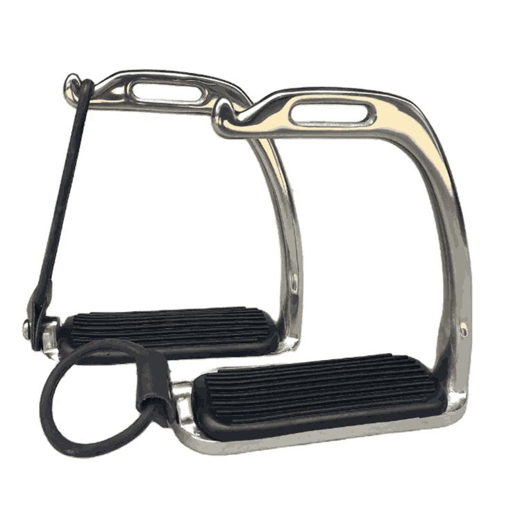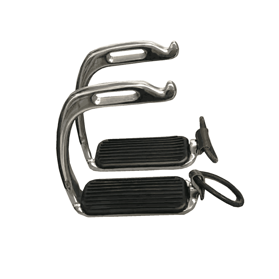 Klassische Form mit seitlicher Lederschlaufe und Gummiring, damit der Fuß bei Gefahr leichter aus dem Bügel gleiten kann. Edelstahlsteigbügel mit schwarzen Gummieinlagen. Werden paarweise geliefert.