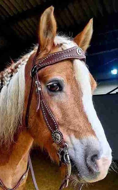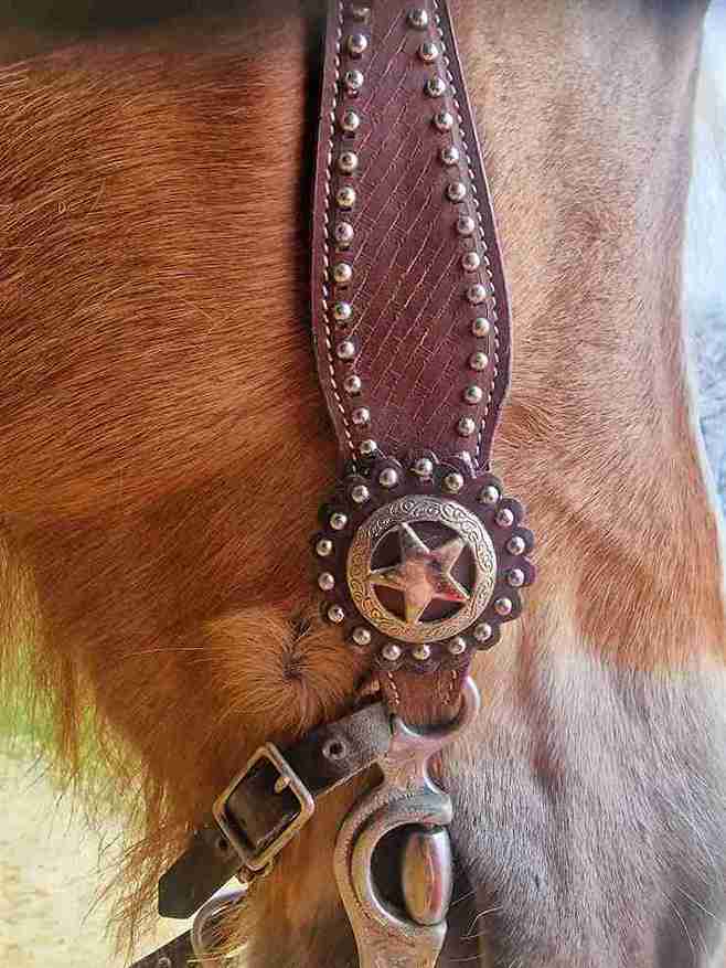 Mit Nieten und Conchos an Stirnband und Backenstücken.